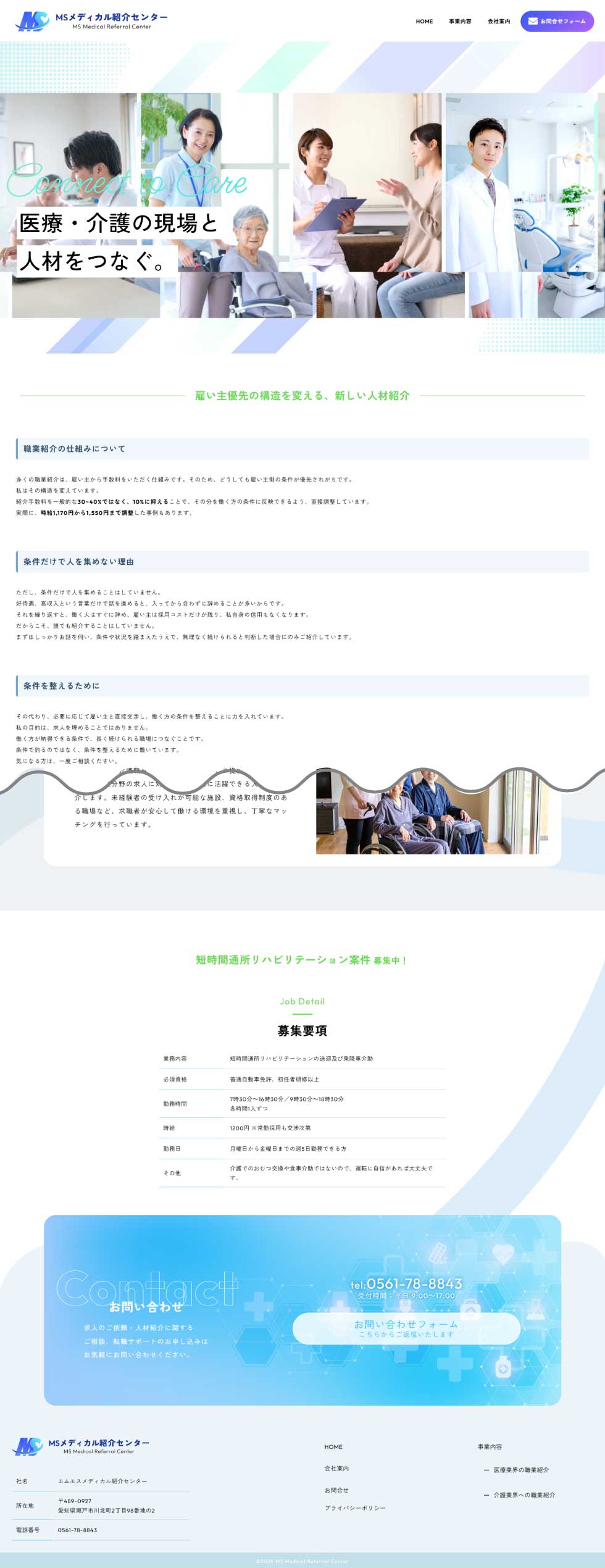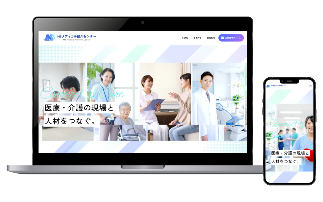 医療・介護業界に特化した職業紹介サービスを提供する企業で、求職者一人ひとりの希望に寄り添いながら、病院・クリニック・介護施設など最適な職場とのマッチングを行われているエムエスメディカル紹介センター様のホームページを制作させていただきました。